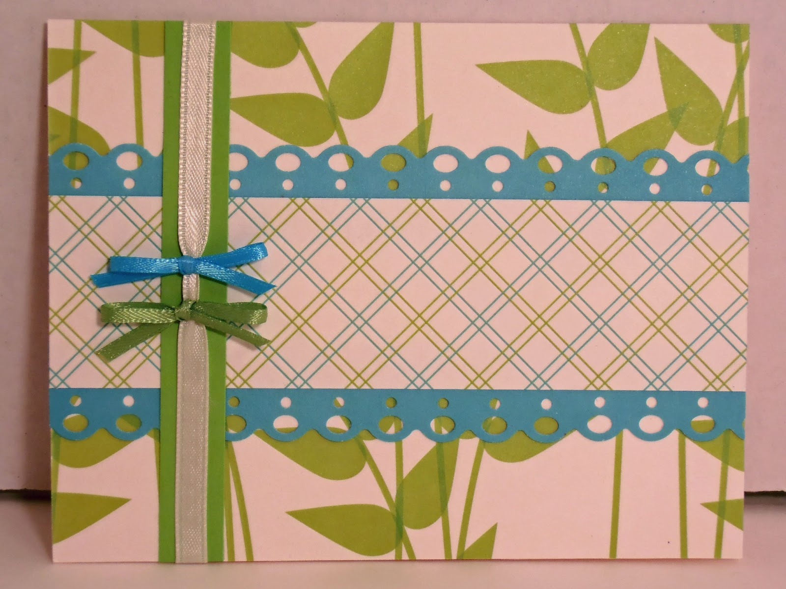 This is OWH Sketch #165. This also is part of the OWH Midweek Throwdown for March 13, 2013. It uses three papers from the DCWV stack, including the leaves, criss-cross and the solid blue. The edger is from Fiskars. The ribbons are all Spool o' Ribbon and the green strip under the cream ribbon is cardstock from my paper stash. I really liked how this card came together.